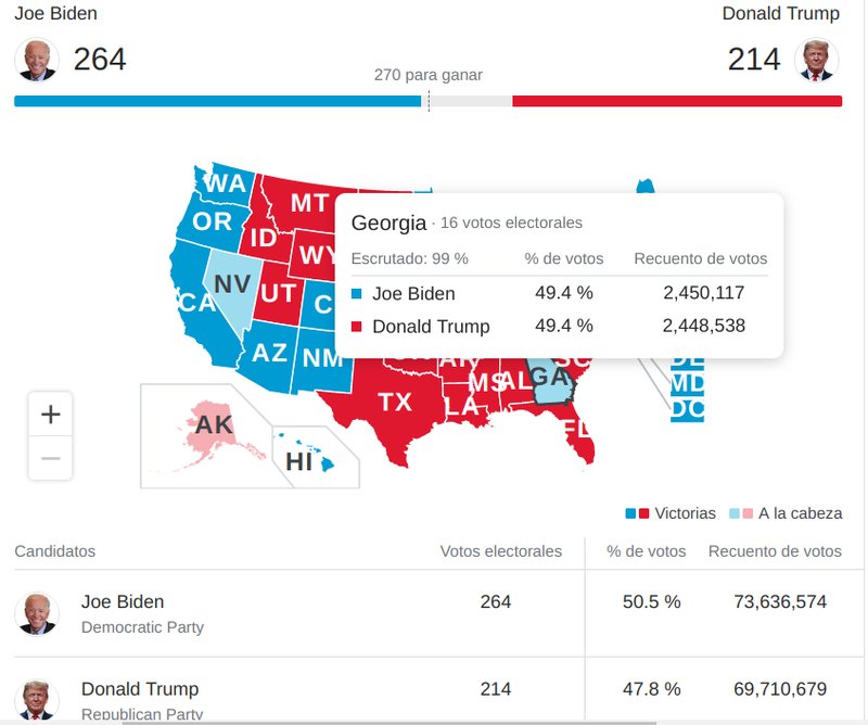 Al avanzar el conteo, Biden volteó a su favor el estado de Georgia. De conseguir la victoria ganará sus 16 votos del Colegio Electoral, suficientes para convertirse en el nuevo presidente de Estados Unidos.
