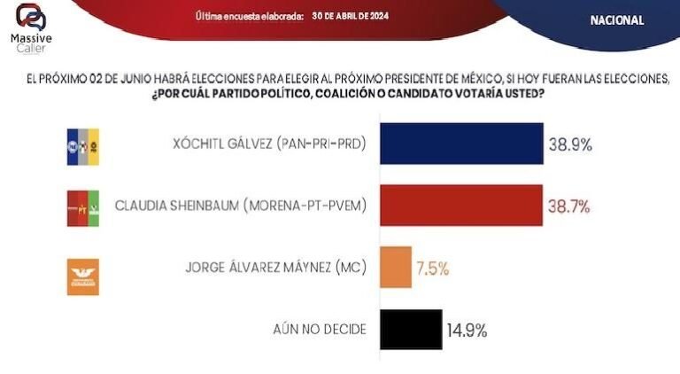 La empresa encuestadora, denominada Massive Caller publicó un ejercicio en donde muestra un empate entre Claudia Sheinbaum de la coalición MORENA-PT-Verde, y Xóchitl Gálvez de la alianza PAN-PRI-PRD.