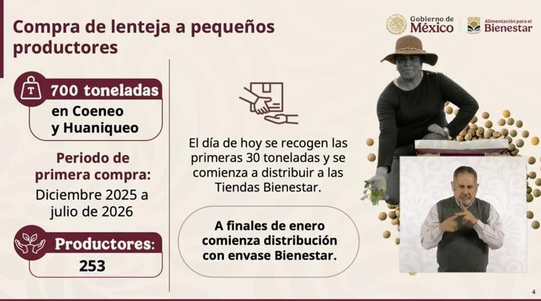 Albores destacó que Michoacán es el principal productor de lenteja en México, por lo que se busca evitar que pequeños agricultores se queden con inventarios sin comercializar. Ya comenzaron las compras directas del producto para garantizar ingresos a las familias productoras.