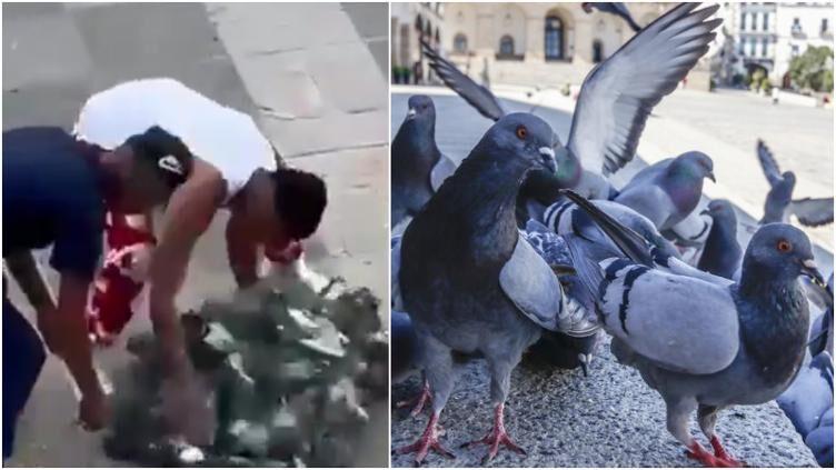 En el video, se puede ver cómo dos sujetos se acercan lentamente a una zona llena de palomas: uno de ellos se aleja para vigilar a las aves y el otro se queda atrás con una red a esperar que la señal de su compañero.