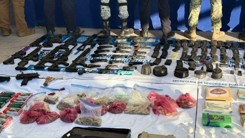 Durante el reconocimiento del inmueble, y tras observar desde el exterior indicios evidentes de actividades ilícitas, se aseguró un arsenal compuesto por 9 armas largas, 30 armas cortas, 36 cargadores para arma larga, 60 cargadores para arma corta, 5 cargadores de tambor, aproximadamente 5 mil cartuchos útiles, 14 chalecos balísticos y 25 placas balísticas.