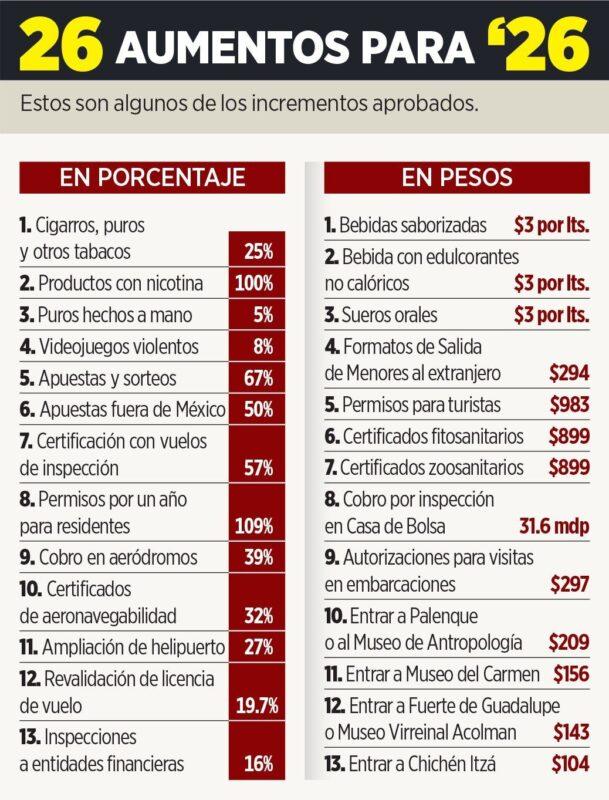 México.- Una inesperada ola de impuestos fue aprobada por la mayoría oficial de la 4T ayer en la Cámara de Diputados que se suma a otros gravámenes especiales a artículos de consumo popular que entrarán en vigencia en 2026, de confirmarse por el Senado.