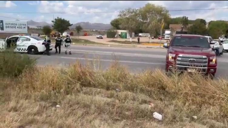 Vecinos del Residencial Leones bloquearon ambos carriles de la carretera Chihuahua-Aldama en el km 15, tras conflicto con la administración del fraccionamiento.