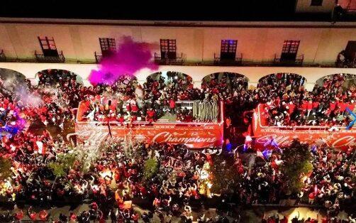 A quienes acompañaron los autobuses desde el inicio se sumaron las miles de personas que ya esperaban a los bicampeones en los principales puntos del Centro Histórico. Los Portales, La Catedral y la Plaza de los Mártires vivieron una auténtica fiesta.
