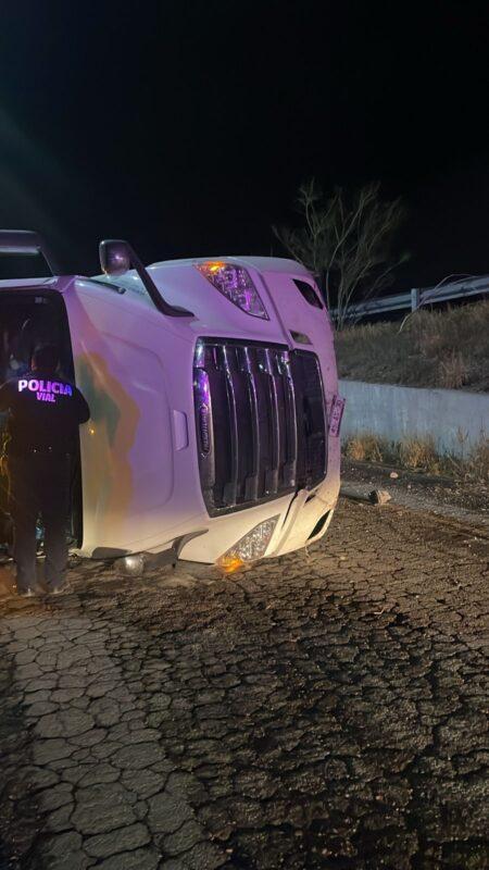 De acuerdo con los primeros reportes, el conductor perdió el control de la pesada unidad, provocando que ésta volcara parcialmente sobre la carpeta asfáltica, ocasionando daños materiales de consideración.