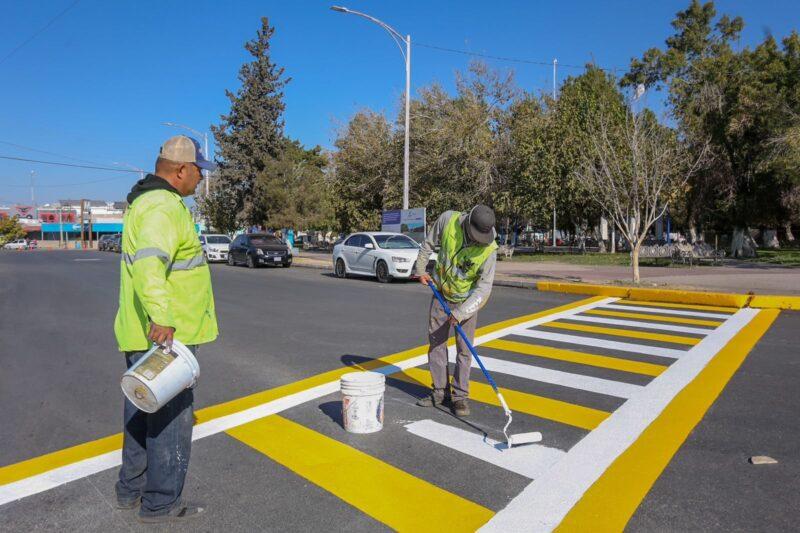 La Dirección de Obras Públicas concluyó la aplicación de pintura de tráfico en las laterales de la Plaza de la República, como parte de los trabajos de rehabilitación integral de esta importante vialidad del centro de la ciudad.