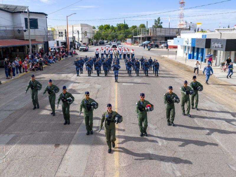 El contingente incluyó la participación de 13 vehículos de caballería de defensa rural, así como 65 efectivos del Ejército Mexicano, tres binomios can adiestrados y 45 elementos de la Fuerza Aérea, quienes mostraron disciplina y compromiso con la patria.