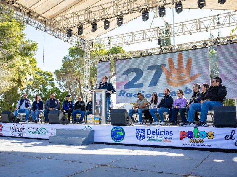 Valenciano García destacó que el Radioteletón representa un esfuerzo genuinamente ciudadano, sostenido a lo largo de casi tres décadas gracias a la participación de empresas socialmente responsables, voluntarios y radiodifusoras locales. “Hablamos de 27 años de un esfuerzo que nació del compromiso de nuestra gente y que hoy sigue demostrando que Delicias es una comunidad solidaria, unida y generosa”, expresó.
