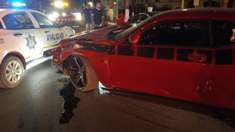 El percance se registró sobre la avenida Agricultura Norte y calle 1ª, donde un vehículo Dodge Challenger color rojo con franjas negras perdió el control y se proyectó hacia el camellón central, impactando directamente el Monumento a los Trabajadores, símbolo representativo de la historia y esfuerzo de los delicienses.
