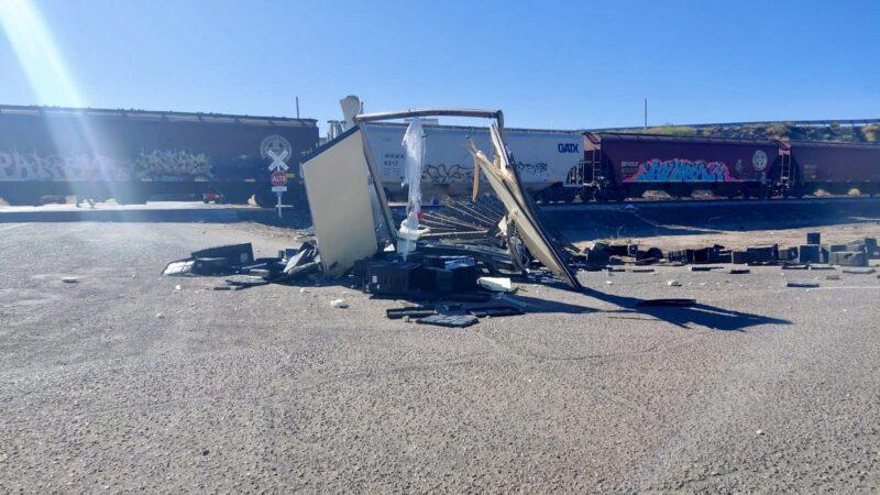 Saucillo, Chih.- La tarde de este jueves, alrededor de las 15:06 horas, se registró un aparatoso accidente ferroviario en el municipio de Saucillo, luego de que un tren impactara contra un tractocamión de carga en la entrada de la colonia San Antonio, a la altura del kilómetro ferroviario 1281 + 280.