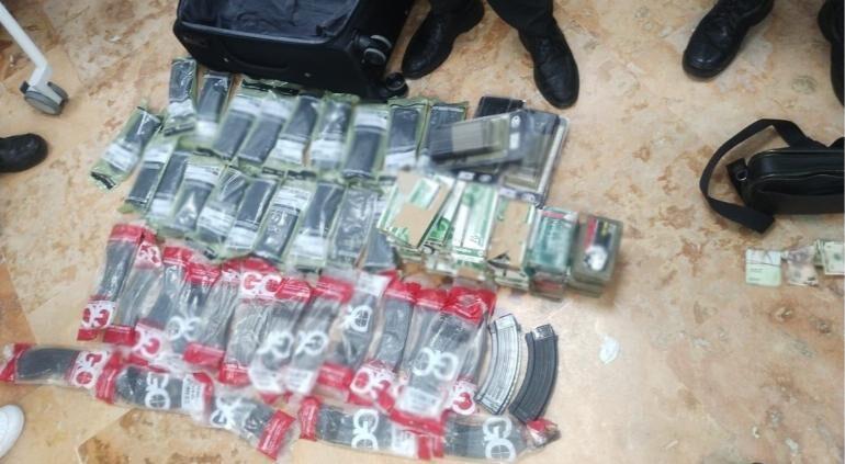 Durante la revisión del equipaje de los pasajeros, los agentes hallaron un fusil de asalto calibre 7.62 milímetros, 3 mil 300 cartuchos útiles, 50 cargadores, un tambor y cinco cintas eslabonadas con 100 cartuchos calibre 5.56 milímetros cada una.