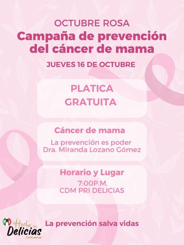 Con motivo del mes de sensibilización sobre el cáncer de mama, integrantes del Comité Municipal del PRI en Delicias realizaron este lunes una jornada informativa en distintas zonas de la ciudad, con el objetivo de promover la detección oportuna y la importancia de la prevención.