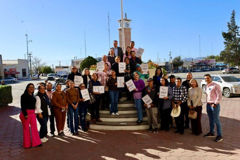 La Comisión Estatal de Vivienda, Suelo e Infraestructura (Coesvi) entregó 16 escrituras a familias del municipio de Delicias que habitan en fraccionamientos IVI-COESVI.