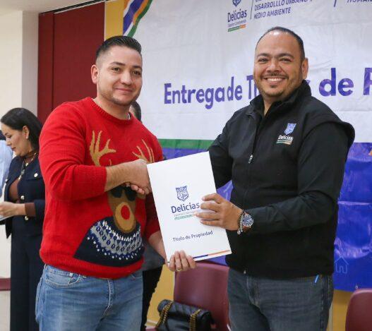 El Gobierno Municipal de Delicias realizó la entrega de 25 títulos de propiedad a familias del municipio, en un acto llevado a cabo en las instalaciones de la Comisión Estatal de los Derechos Humanos (CEDH), como parte de los programas de regularización patrimonial.
