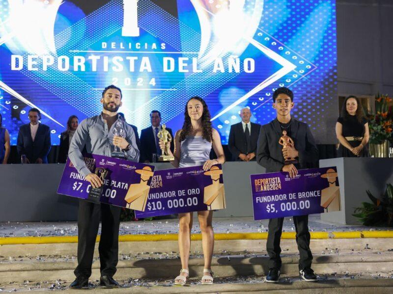“Entre ellos, hoy reconocemos a Jesús Alfredo Pérez Olivas, de 14 años, campeón mundial de Kick Boxing en Tailandia y ganador del Fundador de Bronce; a Abraham García Méndez, triunfador del Fundador de Plata en Fisicoculturismo Natural tras ganar el Natural Olimpia en Las Vegas; y a Etna Mariana Trejo Juárez, de 14 años, ganadora del Fundador de Oro, campeona mundial del mini básquetbol y seleccionada nacional sub 14”, quienes con su dedicación y logros internacionales llenan de orgullo a todo Delicias, señaló Valenciano García.