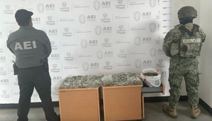 Elementos de la Fiscalía y Ejército Mexicano hallaron una mochila abandonada con 122 envoltorios de marihuana, en el municipio de Cuauhtémoc.