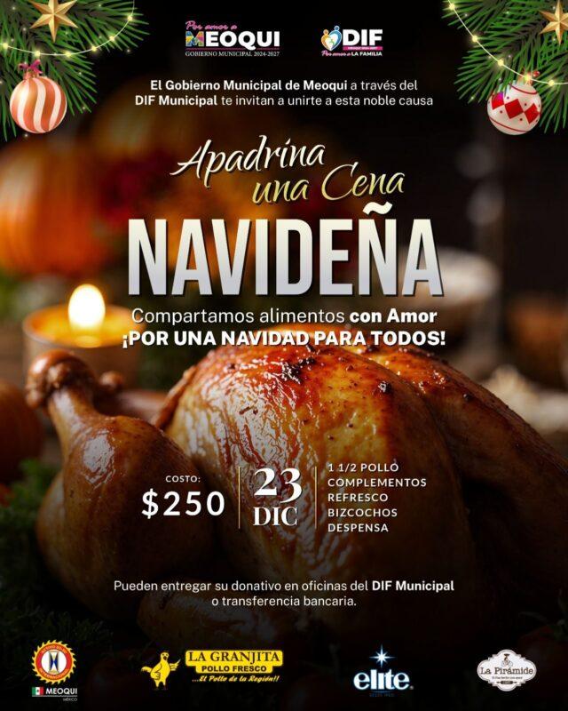 Como cada año, el DIF Municipal de Meoqui invita a la ciudadanía para apadrinar una familia en situación de vulnerabilidad con una cena navideña, la cual será entregada a quien más lo necesita el 24 de diciembre, sumando esfuerzos con el Club Activo 20-30 quienes en esta ocasión se integrarán a esta causa, buscando beneficiar a más de 200 familias con un donativo de 250 pesos por cena.