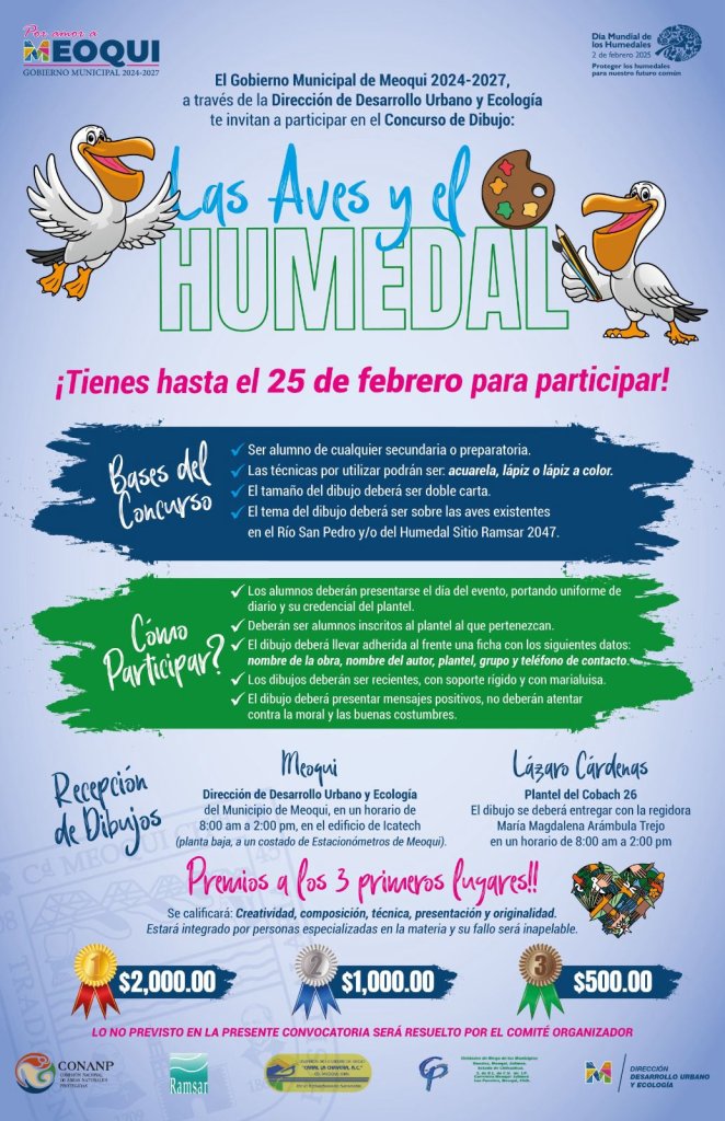 Como parte de las actividades por el Día del Humedal, el Gobierno Municipal de Meoqui, a través de la Dirección de Desarrollo Urbano y Ecología ha lanzado la convocatoria para el concurso de dibujo «Las Aves y el Humedal», dirigido a estudiantes de secundaria y preparatoria que radiquen o estudien dentro del municipio, tienendo como fecha limite hasta el 25 de febrero para inscribirse.