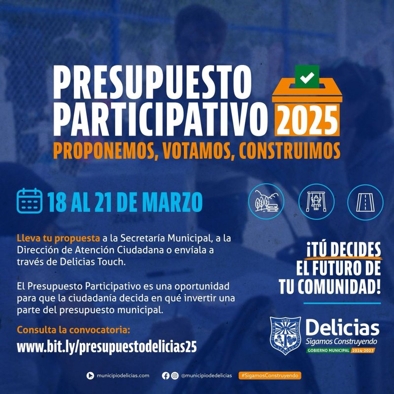 El Gobierno Municipal de Delicias lanzó la convocatoria para el Presupuesto Participativo 2025, un mecanismo que permite a la ciudadanía proponer y decidir en qué proyectos se invertirá una parte del presupuesto público. Con el lema “Proponemos, Votamos, Construimos”, este ejercicio busca fortalecer la participación social y mejorar la infraestructura y servicios de la comunidad a través de propuestas ciudadanas.