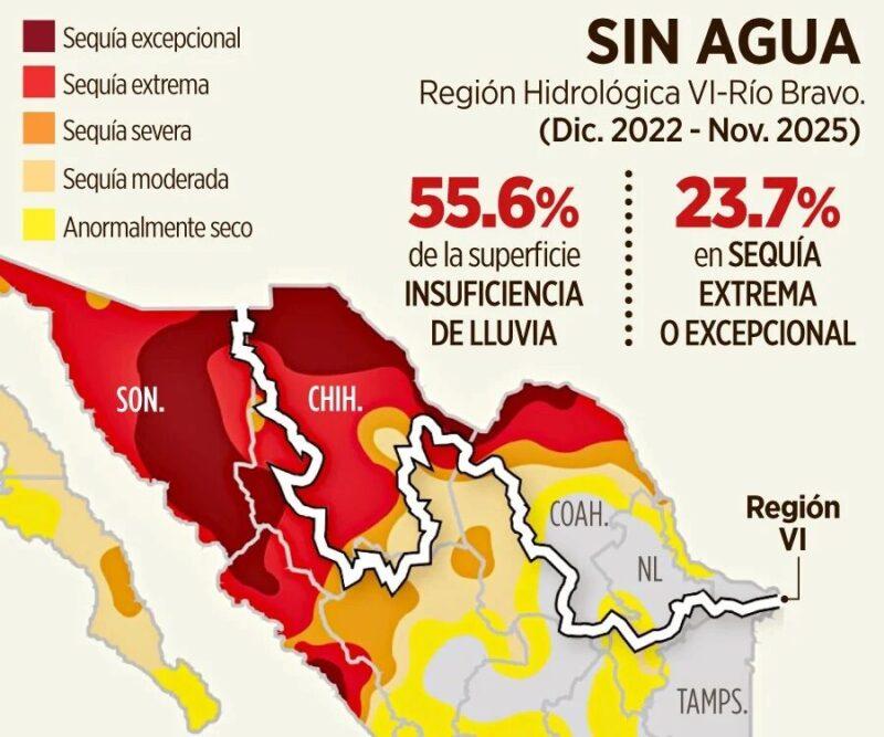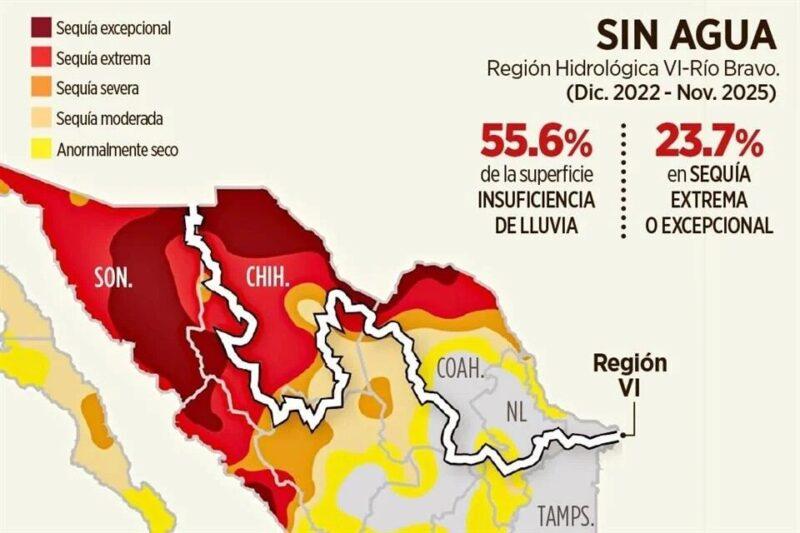 México.- La región hidrológico-administrativa (RHA) Río Bravo, de donde procede el agua que México entrega a Estados Unidos conforme al tratado bilateral de 1944, ha registrado condiciones de sequía durante los últimos 36 meses, de acuerdo con los registros del Servicio Meteorológico Nacional (SMN).