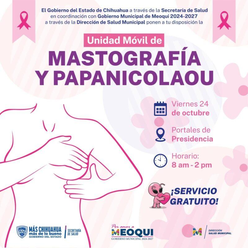 Este viernes 24 de octubre llegarán a Meoqui las Unidades de Mastografías y Papanicolaou de Gobierno del Estado a la explanada de la Presidencia Municipal, con servicios totalmente gratuitos gestionados por la alcaldesa Miriam Soto, los cuales se brindarán a partir de las 8 de la mañana a 2 de la tarde, atendiendo a las mujeres del municipio, todo esto en el marco del Mes es de Sensibilización del Cáncer de Mama.