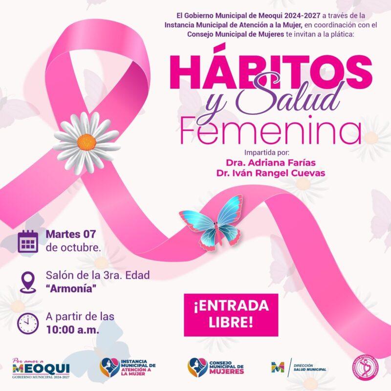 En el marco del Octubre Rosa, Mes de la Lucha Contra el Cáncer en la Mujer, el Gobierno Municipal de Meoqui, a través de la Instancia Municipal de Atención a la Mujer y la Dirección de Salud, en coordinación con la Asociación Civil Luchando por Vivir y Servir, invita a la conferencia “Hábitos y Salud Femenina” que se llevará a cabo este martes 7 de octubre a las 10 de la mañana en el salón del Grupo de la Tercera Edad Armonía.