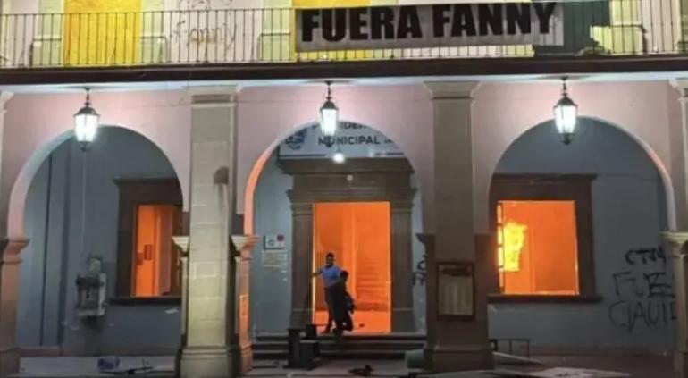 Manifestantes rompieron puertas, vidrios y entraron al edificio donde provocaron un incendio en la planta baja del inmueble. También colgaron una manta en el balcón principal para exigir la renuncia de la alcaldesa.