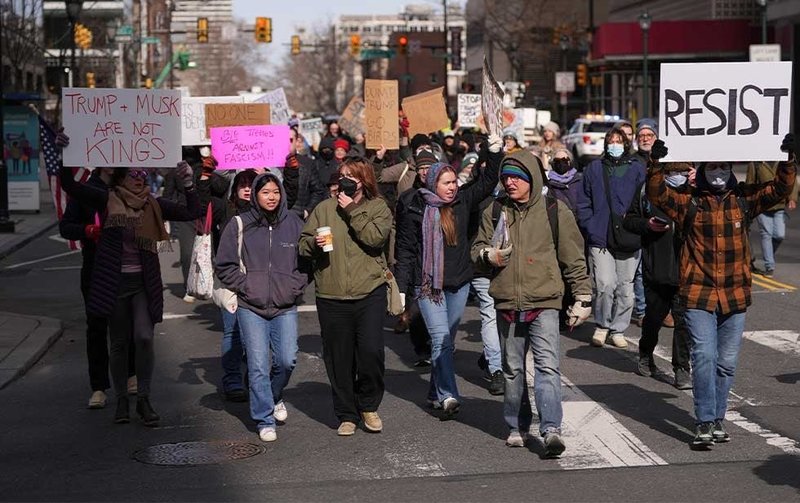 Los manifestantes exhibieron pancartas contra Trump; el multimillonario Elon Musk, líder del nuevo Departamento de Eficiencia Gubernamental de Trump; y el Proyecto 2025, un manual de la extrema derecha para el gobierno y la sociedad estadounidenses.