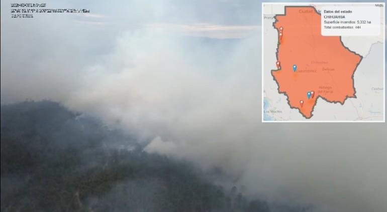 La Conafor señala que en suma los incendios activos dentro del territorio chihuahuense afectan un área aproximada a 5,309 hectáreas, mientras que el espacio afectado por el otro par fue de 23 hectáreas.