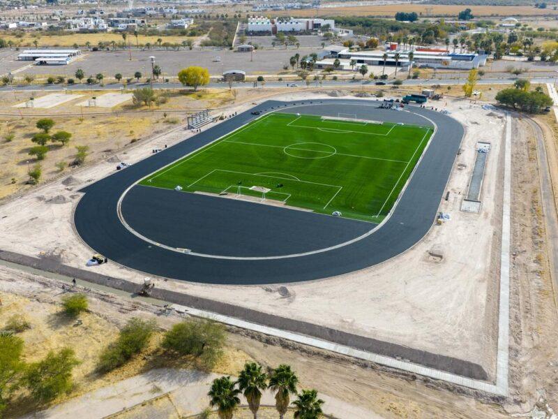 Rodríguez Porras destacó que, de manera paralela, la cancha de fútbol ya se encuentra completamente marcada y pintada, con las líneas delimitantes debidamente definidas, así como las porterías ya instaladas, lo que representa un avance significativo en el proyecto.