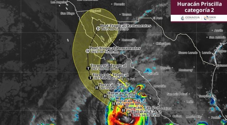 El ciclón Priscila se intensificó a huracán de categoría 2, mientras que su trayectoria prevista tiene cambios, con la posibilidad de tener impactos directos en Baja California y Sonora.