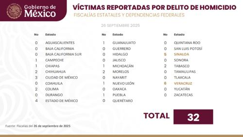 La Comisión Nacional de Seguridad (CNS) publicó el reporte de homicidios dolosos del día viernes 26 de septiembre con un total de 32 casos.