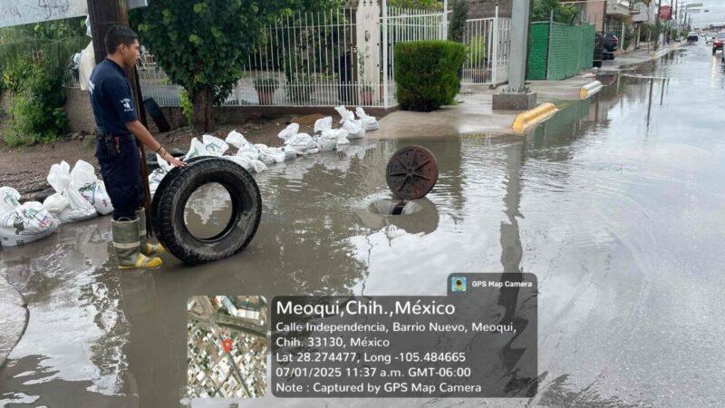 Durante las últimas horas, el municipio de Meoqui registró 72 mm de lluvia por lo que la Dirección de Seguridad Pública Municipal continúa con el operativo donde se han atendido reportes de inundaciones, derrumbes y otros apoyos como la entrega de hule a más de 140 familias y más de 160 costales de arena, así como también atendieron las principales zonas de inundaciones como lo es la Col. Genaro Vázquez y San Antonio, donde actualmente se encuentran guardas para acumulación de motobombas en cuanto comience la acumulación de agua en esa área.