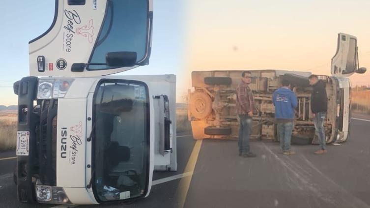 Un camión Isuzu de Beef Store volcó en el km 141 de la carretera Cuauhtémoc-La Junta, obstruyendo el tráfico; la Guardia Nacional acude a removerlo mientras se desconocen causas y estado del conductor.