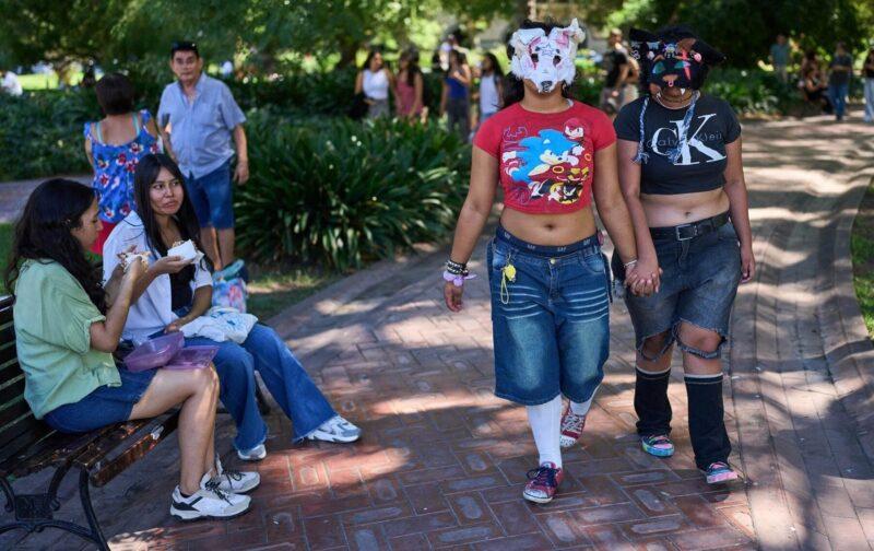 Con el pelo de rojo furioso y un collar con su nombre, Aguara —que tiene 125.000 seguidores en TikTok— se tomó fotografías con otros jóvenes mientras curiosos miraban con recelo a los chicos que merendaban sentados en el césped con colas, garras y hocicos de perros, focas y cabras.