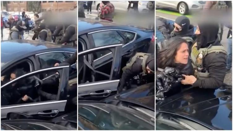 De acuerdo con las imágenes que circularon durante las últimas horas, la mujer intentaba avanzar con su automóvil por una calle donde se realizaba una protesta frente a una vivienda que estaba siendo allanada por la agencia federal. Al intentar continuar su trayecto, fue interceptada por los agentes.
