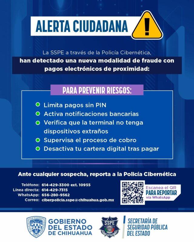 • En caso de detectar cargos no reconocidos, apagar temporalmente la tarjeta desde la aplicación bancaria.Ante cualquier duda o sospecha, la ciudadanía puede comunicarse con la Policía Cibernética de la SSPE a través del teléfono 614 429 33 00, extensión 10955, vía WhatsApp al 656 280 95 62, o mediante el correo electrónico ciberpolicia.sspe@chihuahua.gob.mx.