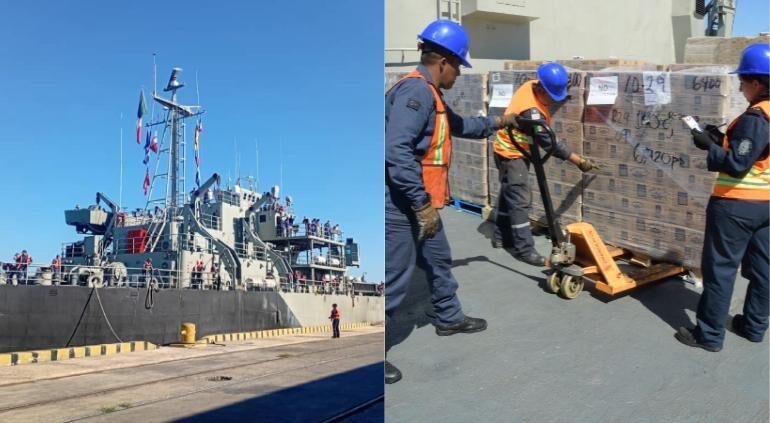 El Papaloapan ingresó primero a la bahía con 536 toneladas de alimentos y productos básicos, entre ellos leche líquida, carne, arroz, frijol, atún, sardinas, aceite vegetal y artículos de higiene personal. Minutos después atracó el Isla Holbox con más de 277 toneladas de leche en polvo.