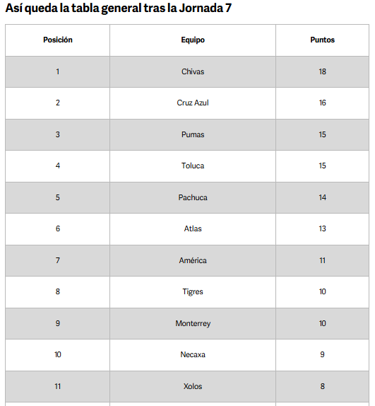 Este domingo se terminó la Jornada 7 del Clausura 2026 de la Liga MX, aunque no todos los partidos se jugaron, ya que el Querétaro contra FC Juárez tuvo que aplazarse por la ola de bloqueos y violencia ocasionada por el abatimiento de Nemesio Oseguera Cervantes «El Mencho», fundador y líder del Cartel Jalisco Nueva Generación (CJNG).