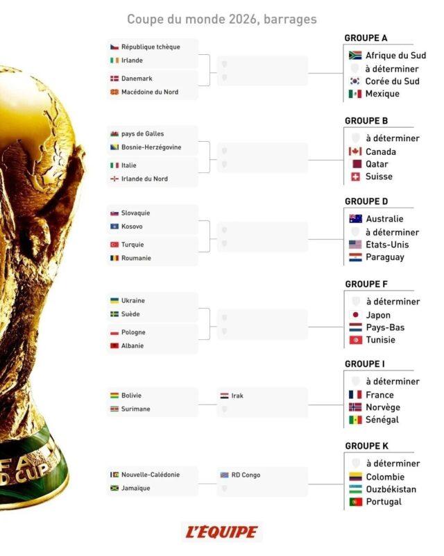 En la primera llave, República Checa se enfrentará a Irlanda y en otro duelo, Dinamarca se medirá a Macedonia del Norte. Los ganadores de estos encuentros se enfrentarán para definir a la Selección que estará en el Grupo A, donde serán rivales de México, Sudáfrica y Corea del Sur.