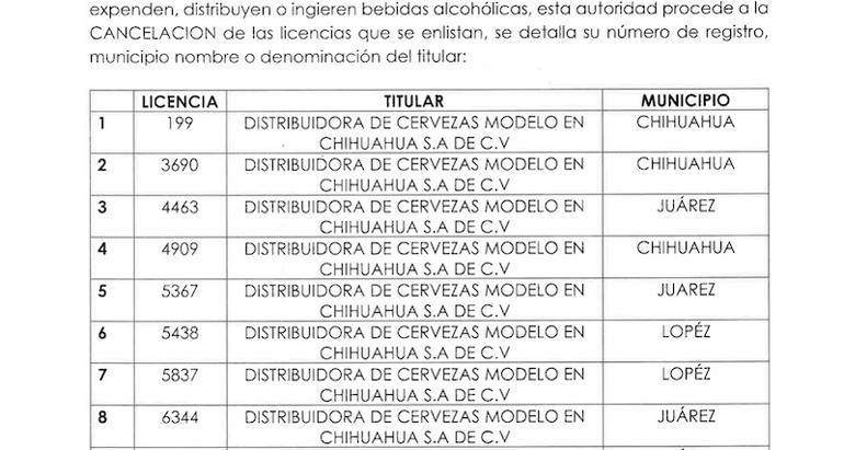 El Gobierno del Estado de Chihuahua canceló más de 200 licencias para la venta de bebidas alcohólicas que estaban registradas a nombre de la empresa Distribuidora de Cervezas Modelo en Chihuahua, S.A. de C.V., medida que quedó formalizada mediante un acuerdo publicado este 2 de enero en el Periódico Oficial del Estado.