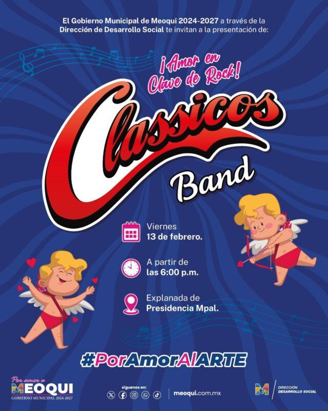 Con canciones como “Fue en un café”, “El último beso”, “Te juro que te amo” y grandes éxitos en inglés, este viernes 13 de febrero se llenará de música la explanada principal durante el festival “Amor en Clave de Rock”, como parte del programa “Por Amor al Arte”, a partir de las 6:00 de la tarde en el marco del Día del Amor y la Amistad, con la presentación de la agrupación Clásicos Band de Meoqui, que se caracteriza por interpretar clásicos del rock en español e inglés de bandas como Los Apson, Terrícolas, Ángeles Negros, The Beatles, Bee Gees, Creedence, entre otros.