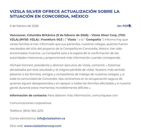 “Vizsla Silver Corp. (TSX: VZLA) (NYSE: VZLA) ( Frankfurt: 0G3 ) (“ Vizsla ” o la “ Compañía ”) informó hoy que varias familias le han informado que sus parientes, nuestros colegas, quienes fueron rescatados del sitio del proyecto de la Compañía en Concordia, México, han sido encontrados muertos. La Compañía está a la espera de la confirmación de las autoridades mexicanas y proporcionará más información cuando corresponda.