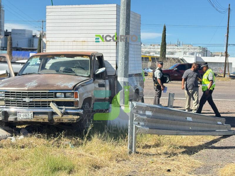 Delicias, Chih.- Daños materiales de consideración y dos personas lesionadas fue el saldo que dejó un accidente registrado la mañana de este martes en el entronque de la carretera federal 45 y el acceso a Las Moras, a un costado de la caseta de la Guardia Nacional.