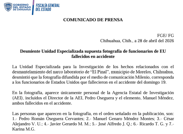 La Unidad Especializada para la Investigación de los hechos relacionados con el desmantelamiento del narco laboratorio de “El Pinal”, municipio de Morelos, Chihuahua, desmintió que la fotografía difundida por el medio de comunicación Milenio, corresponda a los funcionarios de Estados Unidos que fallecieron en el accidente del domingo 19.