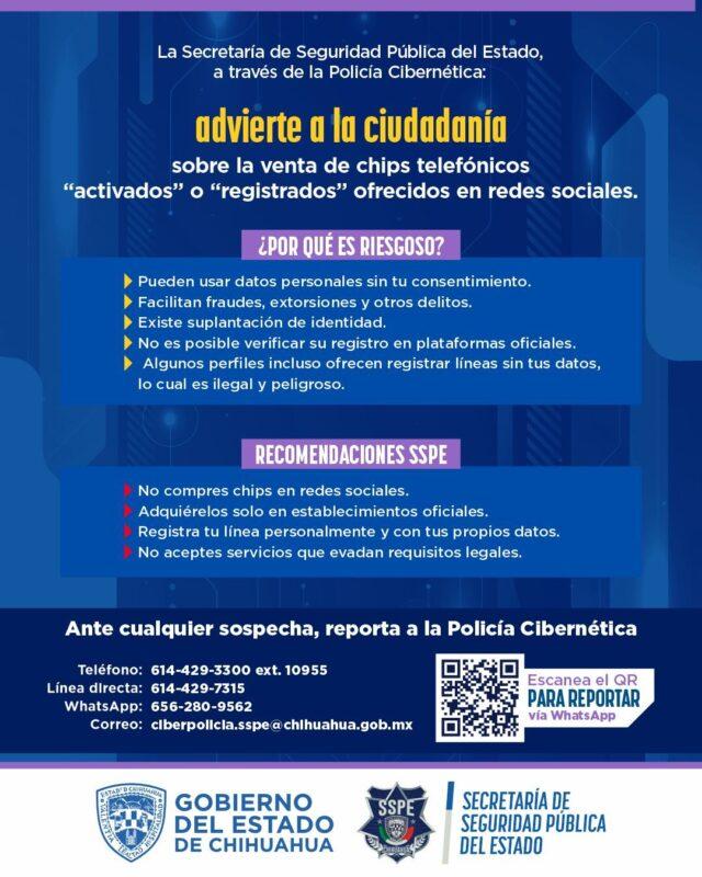 Para orientación y reportes, la ciudadanía puede comunicarse al 614 429 3300 extensión 10955, al número directo 614 429 7315, al WhatsApp 656 280 9562, o al correo electrónico ciberpolicia.sspe@chihuahua.gob.mx