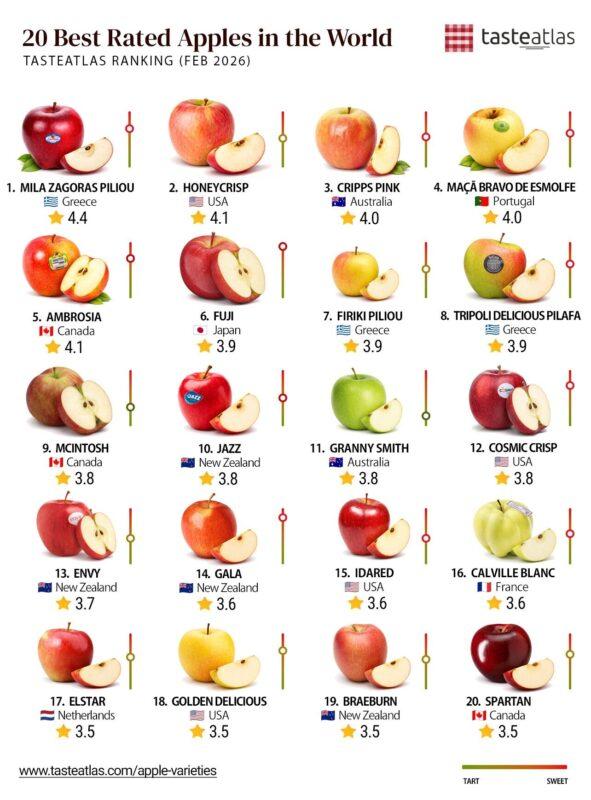 Según Taste Atlas, las mejores manzanas del mundo, por calificación (siendo la máxima 5) son: