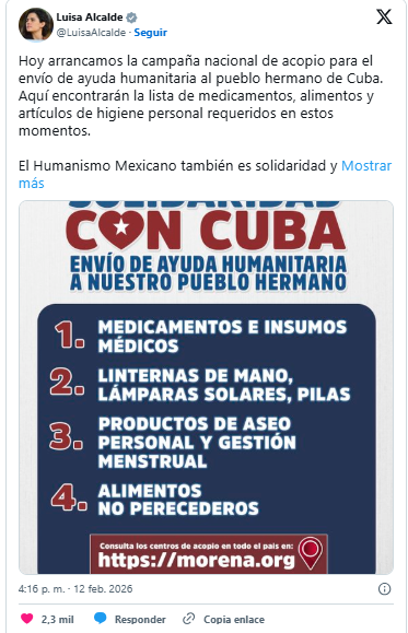 La presidenta nacional de Morena, Luisa Alcalde, dio a conocer que este jueves inició la campaña nacional de acopio para el envío a Cuba.