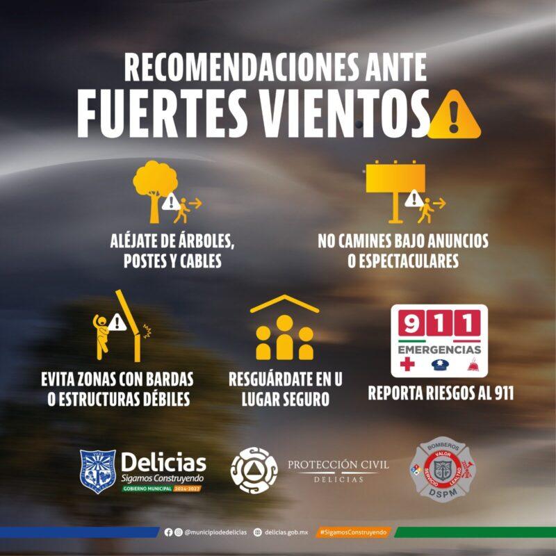 Ante los fuertes vientos que ya comienzan a sentirse en Delicias y la región Centro-Sur, autoridades de Protección Civil en Delicias hicieron un llamado a la ciudadanía a tomar precauciones para evitar accidentes o daños materiales. El titular de la dependencia en el municipio, Roberto Márquez, alertó que las rachas podrían superar entre los 55 y 65 kilómetros por hora durante los próximos días, por lo que pidió a la población mantenerse atenta y actuar con responsabilidad.