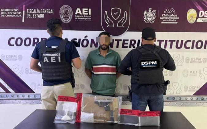 La detención en flagrancia del imputado estuvo a cargo de elementos de la Agencia Estatal de Investigación (AEI), y de la Unidad de Inteligencia Policial (UIP) de la Dirección de Seguridad Pública Municipal la (DSPM), en posesión de un arma de fuego calibre .9 milímetros, ocho cartuchos útiles, y 35.1832 gramos de metanfetamina.